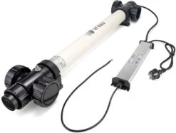 De UV-C lamp installeer je als laatste onderdeel in je techniekinstallatie, dus voordat het water weer naar het zwembad gaat. De lamp werkt op 230v netstroom