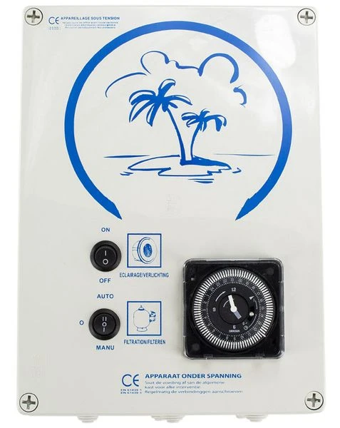 Zet je pomp, verlichting en verwarming op een automatische sturing om meer controle te krijgen over de looptijd en daarmee het energieverbruik van je installatie. Met deze uitgebreide sturingskast heb je de mogelijkheid om een dagklok in te stellen of de zwembadpomp handmatig in te schakelen door de schakelaar op de schakelkast.