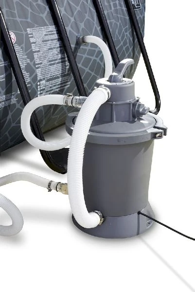 De meegeleverde zandfilterpomp zorgt voor een effectieve filtering van vuildeeltjes in het water. Dit watercirculatiesysteem pakt zelfs de kleinere deeltjes aan en is veel effectiever dan een filterpomp met cartridges. In het filtermateriaal blijft vuil zoals zand, algen en insecten achter. Zo weet je zeker dat een frisse duik in dit zwembad ook echt een frisse duik blijft. De zandfilterpomp heeft een capaciteit van 3028 liter per uur, waardoor de volledige inhoud in ongeveer 4 uur wordt rondgepompt. Deze zandfilterpomp wordt geleverd zonder het benodigde filterzand, vergeet dit niet bij je bestelling mee te bestellen. Voor deze zandfilterpomp heb je 10 kg filterzand nodig.
