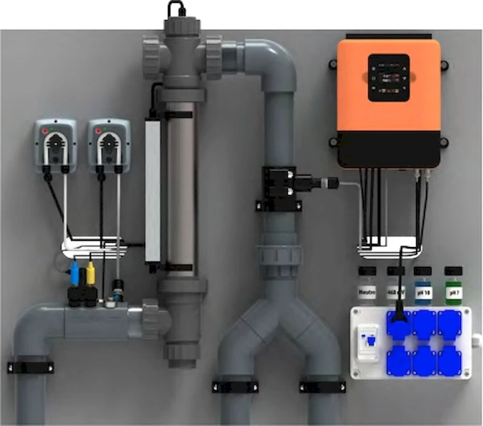 - Flowkamer met flowswitch, temperatuursensor, pH/rX sondes, aarding en injectieventiel